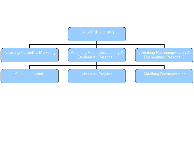 ■ 14.5.10 Planungsteam Das Planungsteam setzt sich aus dem Qualitätsleiter, dem Sicherheitsbeauftragten, den Mitarbeitern der Auftragsbearbeitung, Disposition sowie dem Projektleiter zusammen. Das Team unterstützt den Qualitätsleiter und erarbeitet Vorschläge zum Qm-System. Das Team ist weiterhin Ansprechpartner in allen belangen des Qualitätsmanagements insbesondere bei der Überwachung der eingeleiteten Korrekturmaßnahmen und bei der Pflege der Systemdokumentation. ■ 14.5.11 Leitung Marketing / Vertrieb Die Leitung Marketing/Vertrieb bildet die Schnittstelle zum Kunden und ist verantwortlich für den Auf- und Ausbau der Kundenbeziehung. Sie ist verantwortlich für Programmpolitik, Preispolitik, Distributionspolitik, Kommunikationspolitik und Servicekonzept. Sie ist der Geschäftsleitung direkt unterstellt. ■ 14.5.12 Abteilung Arbeitsvorbereitung Die Abteilung Arbeitsvorbereitung bildet die Schnittstelle zwischen der Abteilung Marketing und Vertrieb und der Abteilung Projekte. Ihrer Verantwortlichkeit unterliegen die Arbeitsvorbereitung, die Programmplanung, die Wirtschaftlichkeitsüberwachung, die Termindisposition, die Fristenplanung und die Arbeitskostenplanung, sie ist der Geschäftsführung direkt unterstellt. ■ 14.5.13 Abteilung Projekte Die Abteilung Projekte bildet die Schnittstelle zwischen der Abteilung Arbeitsvorbereitung und der Abteilung Marketing und Vertrieb. Ihrer verantwortlich unterliegt die Auftragsdisposition, die Auftragsbearbeitung, die Bedarfsdisposition, die Arbeitsverteilung und der Fortschrittsüberwachung, sie ist der Leitung Arbeitsvorbereitung unterstellt. ■ 14.5.14 Abteilung Rechnungswesen Die Abteilung Rechnungswesen bildet die Schnittstelle zwischen der Abteilung Arbeitsvorbereitung und Geschäftsführung. Ihrer Verantwortlichkeit unterliegt die Prüfung aller ein und ausgehenden Rechnungen, sowie alle buchhalterischen Vorgänge, sie ist der Geschäftsführung direkt unterstellt.