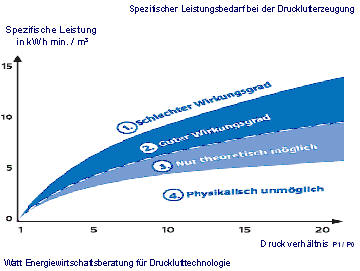 Wissensportal Leistungsbedarf der Verdichtung In der Praxis sind diese theoretischen Werte nicht erreichbar, da der Verdichtungsvorgang mit Verlusten behaftet ist. Gute Druckluftanlagen zeichnen sich durch einen Leistungsbedarf für die Verdichtung aus, der 45 Prozent über dem theoretischen Optimum bei der adiabaten Verdichtung liegt. Die Verdichtungsleistung wird meistens als spezifische Leistung in Kilowatt pro Kubikmeter Luft und Minute angegeben. Mit zunehmender Leistungsgröße der Anlage nimmt der spezifische Leistungsbedarf in der Regel ab. Nach Abb. 1 kann die Effizienz der Drucklufterzeugung grob beurteilt werden. Der Prozess sollte im „guten“ Bereich liegen. Ein Leistungsbedarf, der unterhalb der gestrichelten Linie liegt, ist bei einem realen nicht-isothermen Prozess nicht möglich. Abb.1 Spezifischer Leistungsbedarf bei der Drucklufterzeugung |